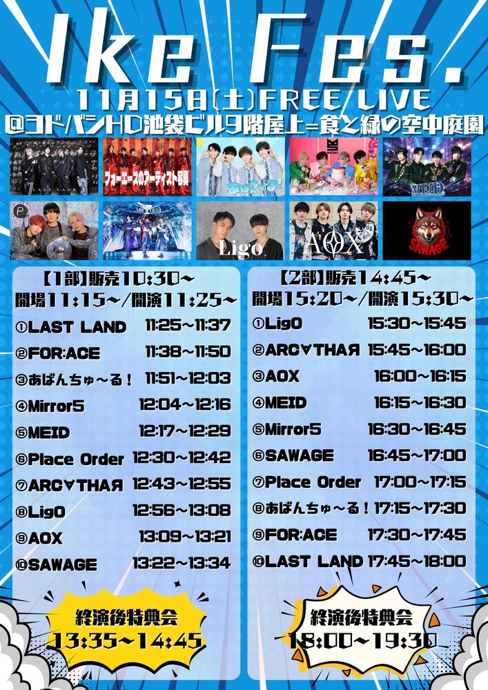 11/15 ike fes SCHEDULE 2025/11/15(土) 12:56 - 2025.11.15(Sat) ※二部制イベントヨドバシHD池袋ビル9階屋上-食と緑の空中庭園-※改装中の為公演場所の変更が御座います※上記によりいつものエレベーターのご利用が出来ません。LOFT方面よりご来場お願いいたします。 出演時間 12:56〜13:08 15:30〜15:45 URLをコピーする 報告する
